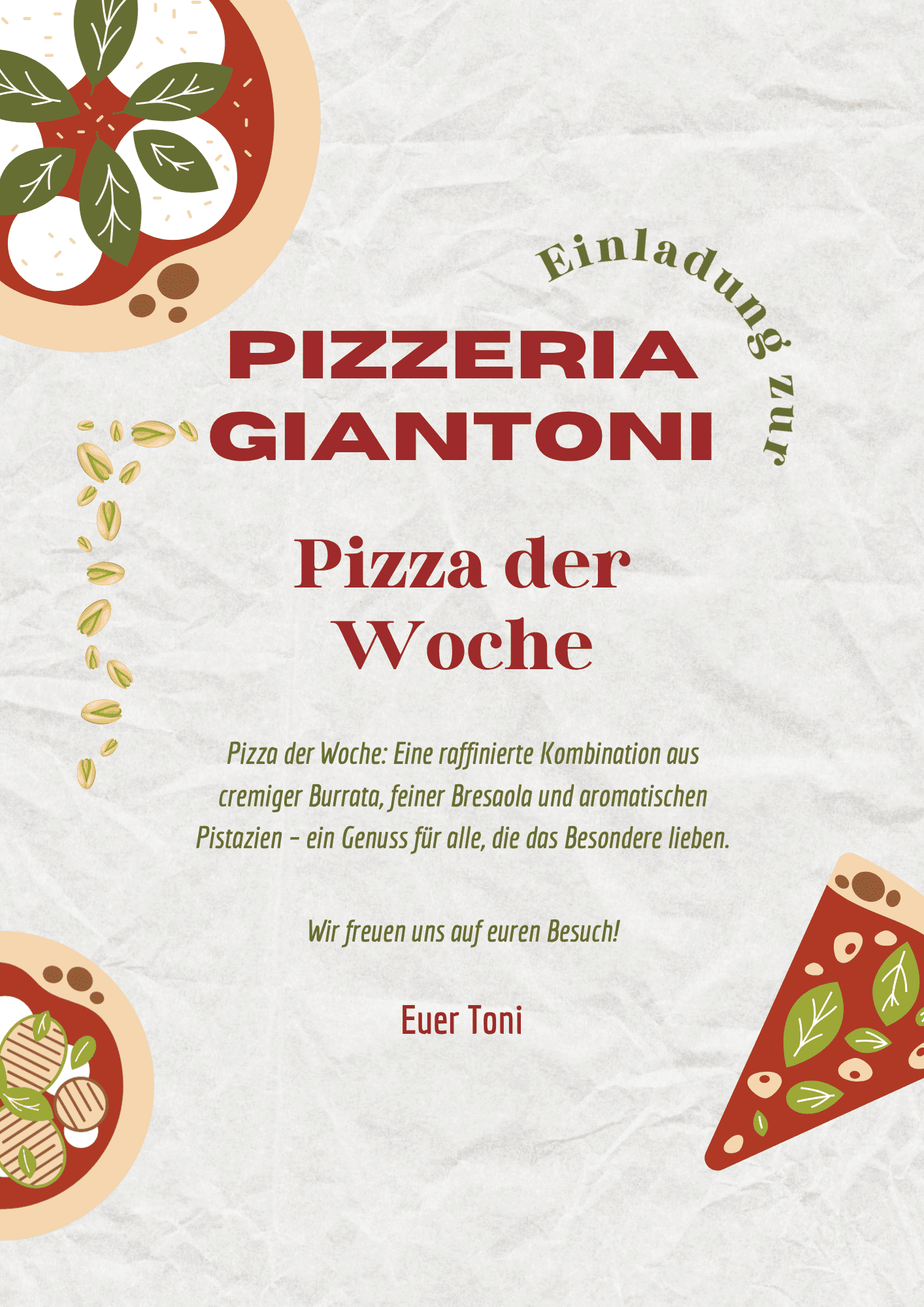 Feiertagsfreude beginnt hier! Wir freuen uns, euch unsere neueste Überraschung mitzuteilen: Exklusive Gutscheine für unsere köstlichen Pizzen sind ab sofort erhältlich! Überrascht eure Liebsten und kommt vorbei, um gemeinsam genussvolle Momente zu erleben!